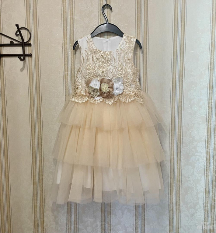 Замечательное праздничное платье для девочки в отличном состоянии. В меру пышное, брошь с цветами снимается, сзади по талии подзатягивается пояском, который завязывается на бант. Подойдёт на девочку от 6 до 8 лет.