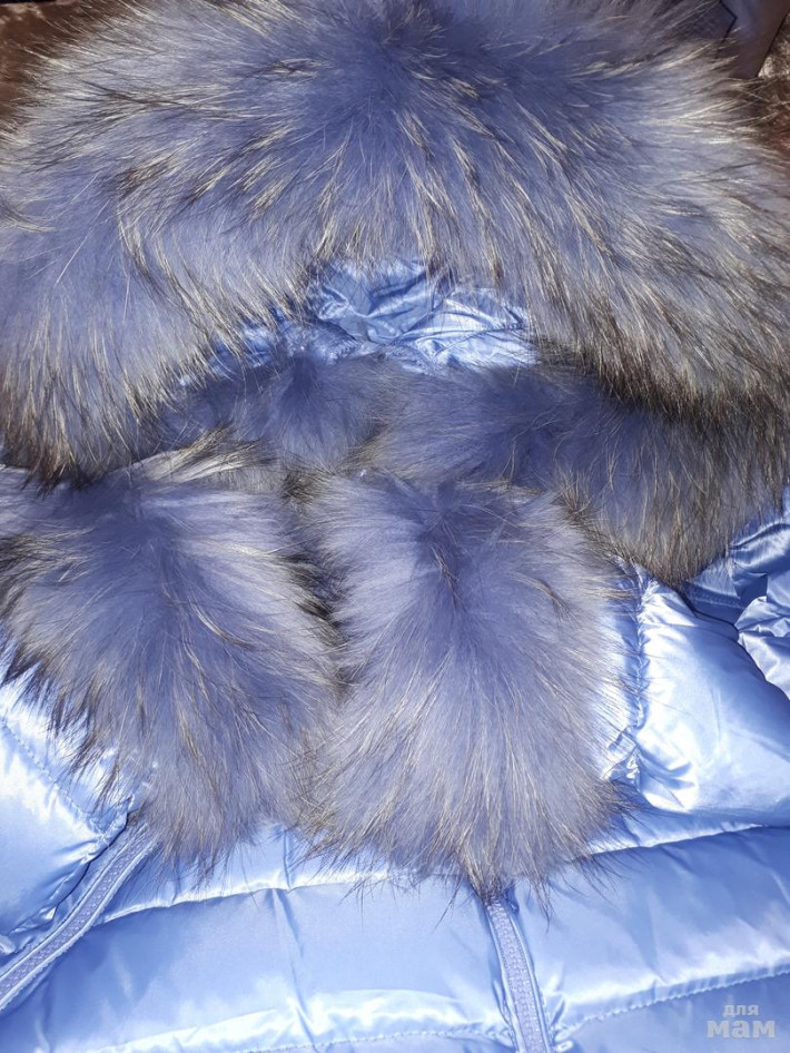 Очень красивого ярко-голубого цвета. Опушка и манжеты енот. Мех съемный. Опушка большая!