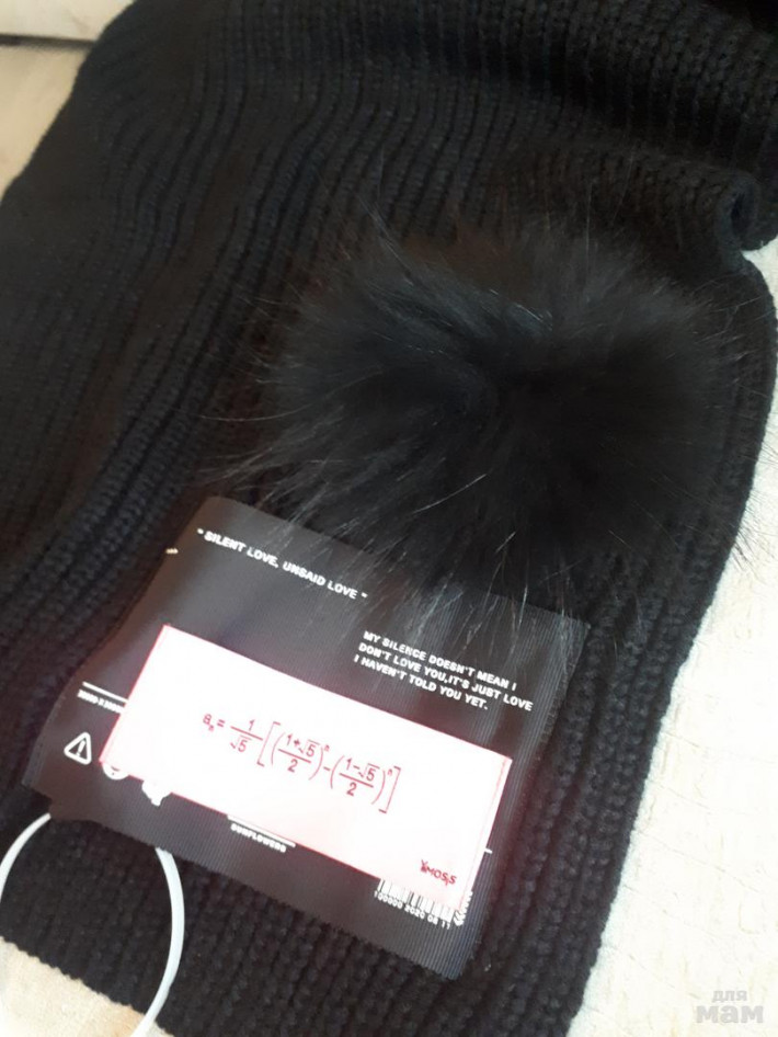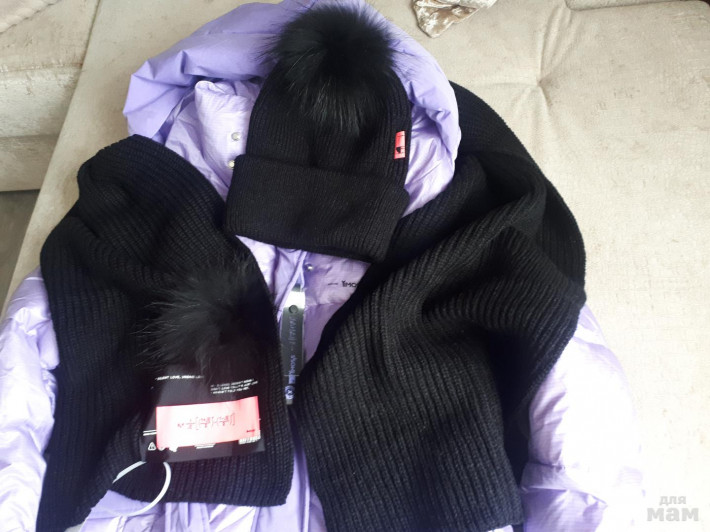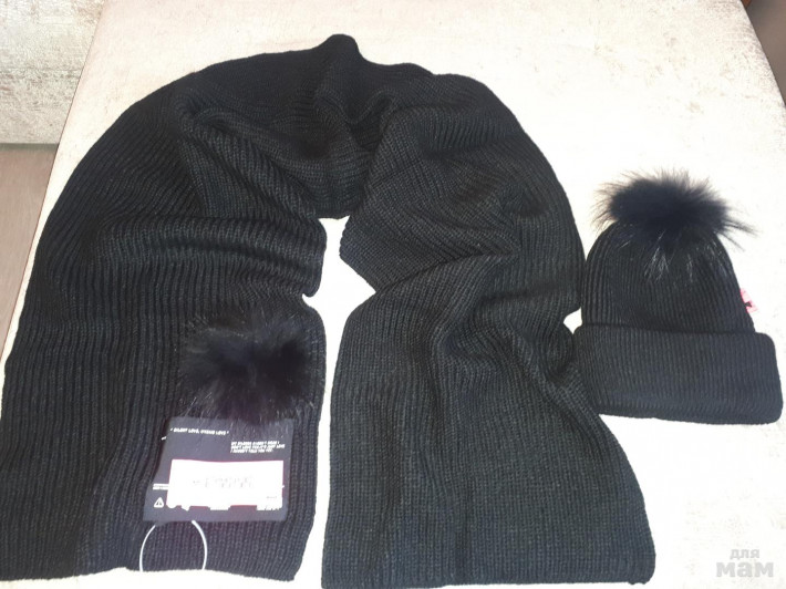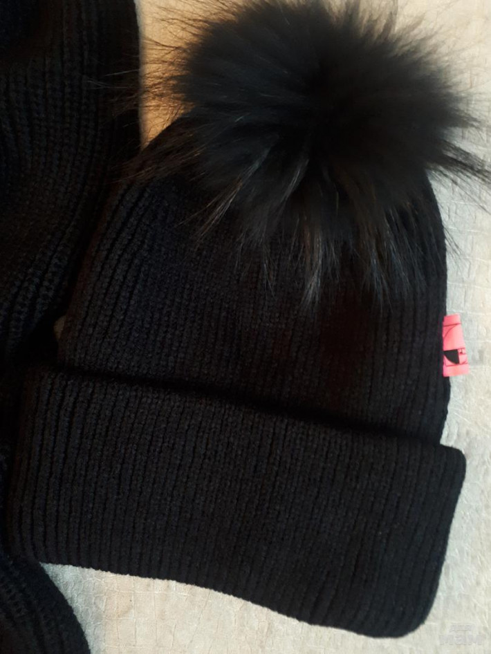 Комплект шапка + шарф. Состав: Акрил 85% шерсть 15%. Помпоны на шапке и шарфе из натурального меха енота. На шапке помпон пришит, на шарфе пристегивается на пуговицу. Цвет насыщенный черный, нашивки ярко-фуксийные. Шарф большой, 200×35, шапка бини на ОГ 56/58. Цена 2500₽