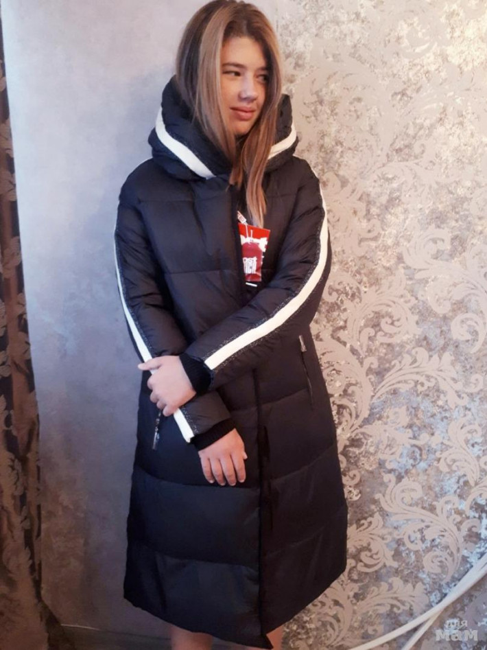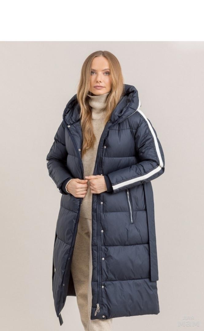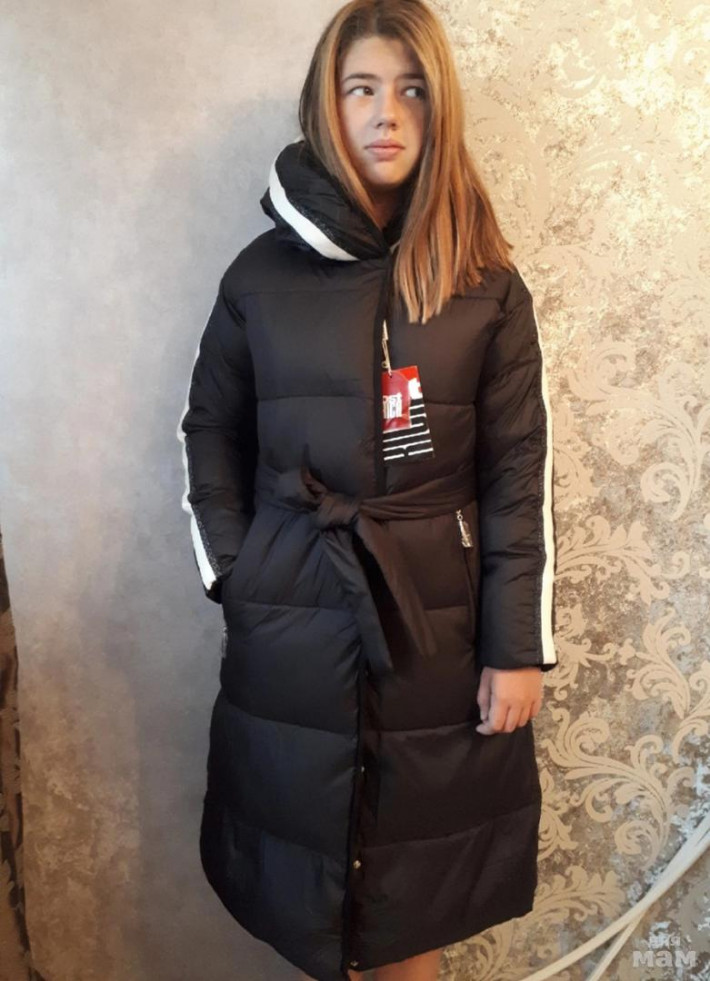 Красивое подростковое пальто с вязаными лампасами. Теплое и легкое. Цвет темно-синий. Наполнитель биопух. В рукавах вязаные манжеты.