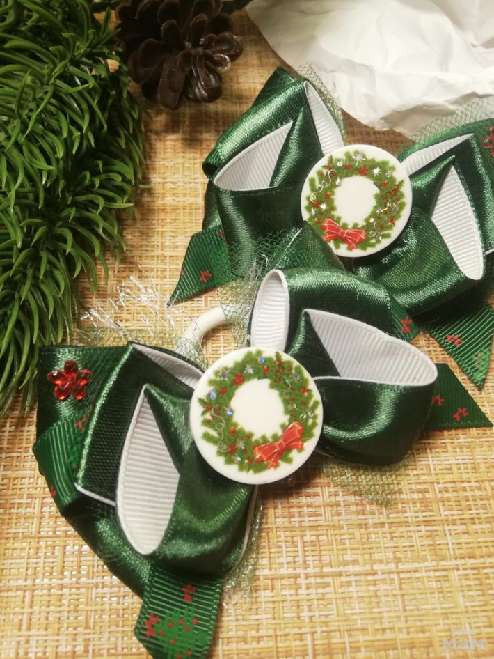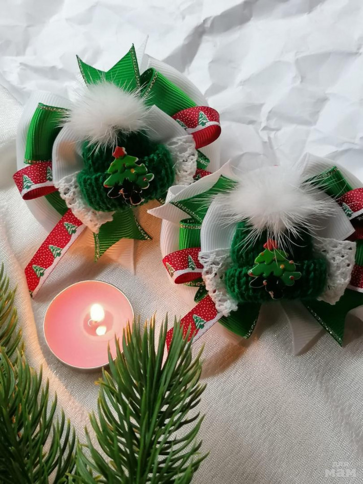 Новогодние бантики выполненные в традиционных цветах зимнего праздника. Красивые, многослойные. Отлично подойдут и для косичек, и для хвостиков