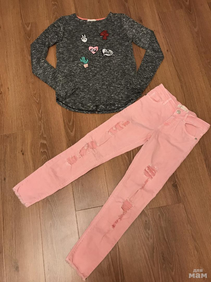 розовые джинсы Зара и серый свитер H&M р.146-152 цена 1500р