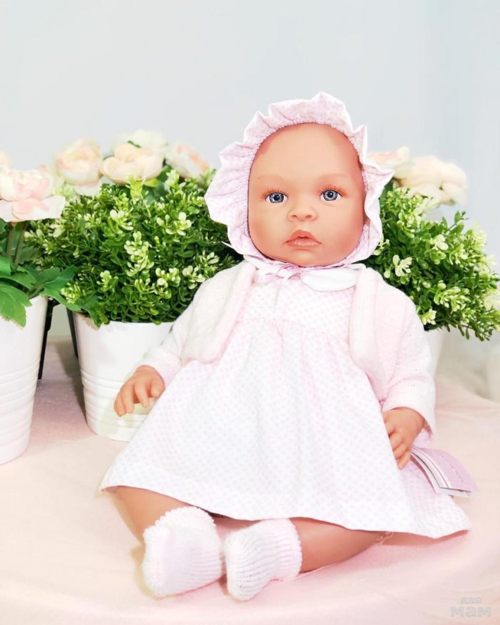 Волос нет, красивые голубые глазки с натуральными пушистыми ресничками, розовые полуоткрытые губки, румянец - все выглядит настолько натурально, что у вас создается впечатление, что перед вами настоящий малыш.