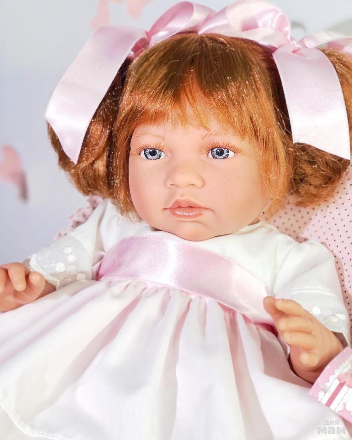 Куколка Нора - само очарование. Рост 46 см. Выполнена из бархатистого винила, тело мягконабивное. Волосы у куклы рыжего цвета, густые и надежно прошитые, приближены к натуральным волосам, поэтому их можно смело мыть, расчесывать и делать различные прически. Глаза голубые с пушистыми ресничками, ротик приоткрыт, по лицу рассыпаны забавные веснушки. Голова, ручки и ножки выполнены очень натуралистично, с детальной проработкой всех складочек, пальчиков, ноготков. Одета Нора в нарядное летнее платье с белым лифом, розовой юбкой и белым передничком с кружевной отделкой. Волосы украшены большими атласными бантами розового цвета. Упаковка - пакет бант