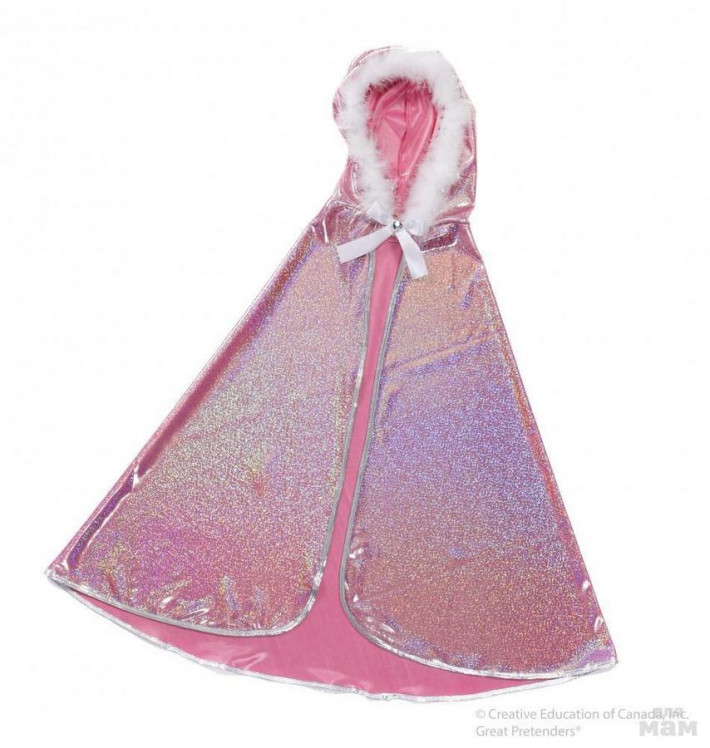 Этот розовый плащ полностью выполнен из специального блестящего материала и украшен белыми перьями. Просто мечта любой девочки!