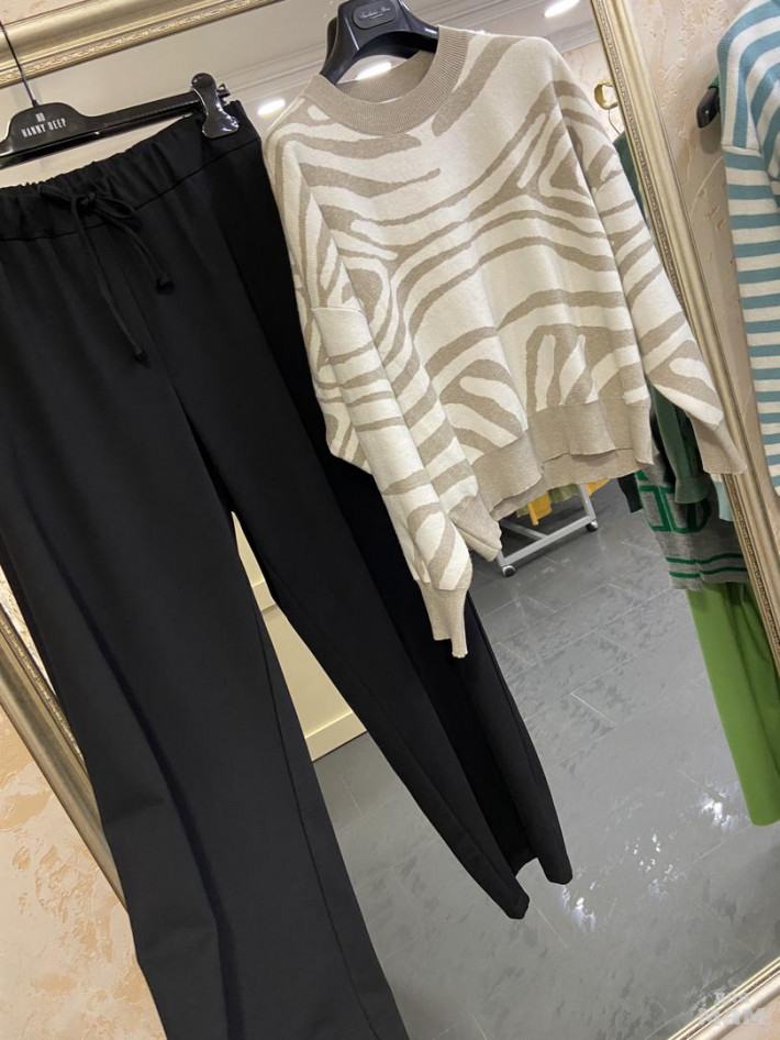 Шикарная практичная ткань. Базовая модель , которая прекрасно будет смотреться с блузками 👍🏻сидят супер ! На талии резинка
