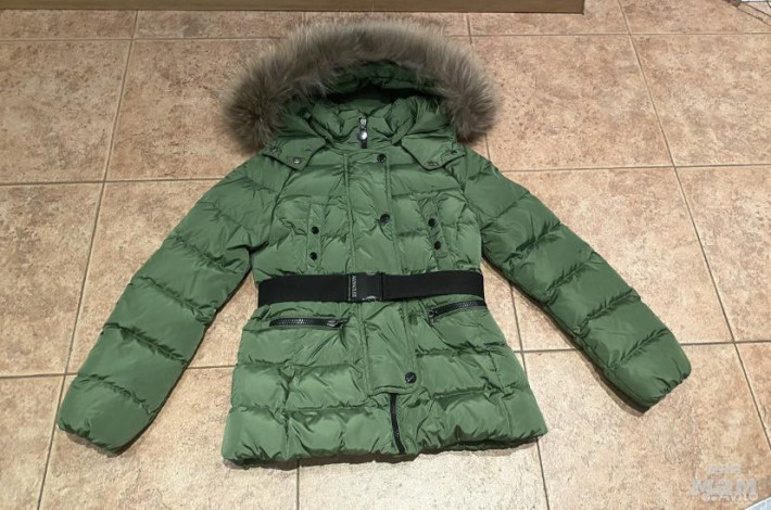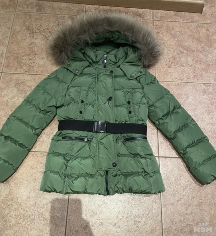 Подойдёт и мальчику и девочке. Цвет зелёный. Маркировка 8 лет, рост 128. Можно носить без пояса. Теплый, легкий. Премиального качества с пожизненной гарантией. Мех и капюшон отстегиваются. Бляшка на поясе в фабричной плёнке, снимается.