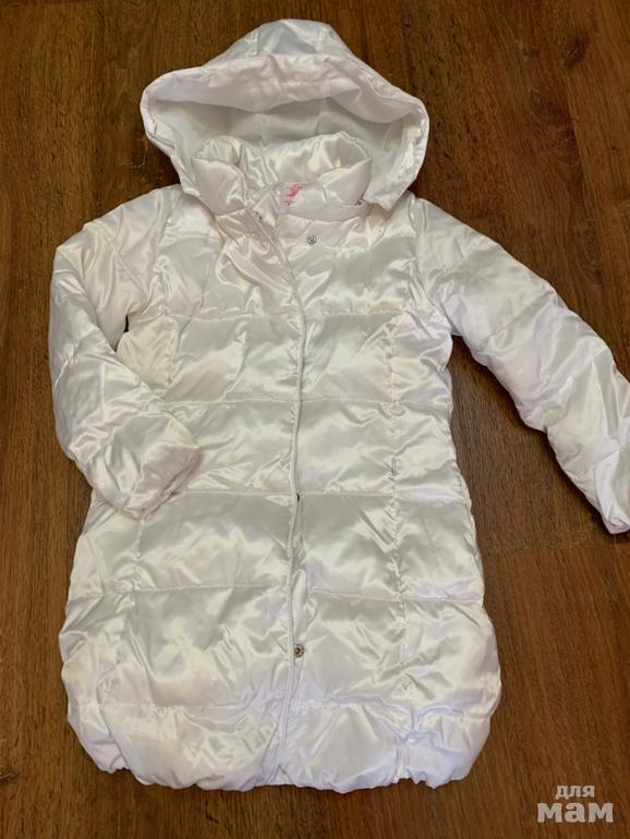 23. Белоснежное пальто Futurino 122 размер, в составе 50% пух-перо. Очень хорошее состояние. Легко стирается, сохнет и выглядит очень нарядно. Цена 1000