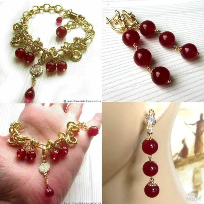 Комплект браслет и серьги из бусин бордового халцедона. Концевик - ювелирная капелька красной шпинели. Крупная брендовая наборная цепь очень красиво и стильно смотрится на руке. Позолота имеет цвет золота 750 пробы, нестираемое покрытие и шикарное качество. Золото и бордо - роскошное, царское сочетание цветов.