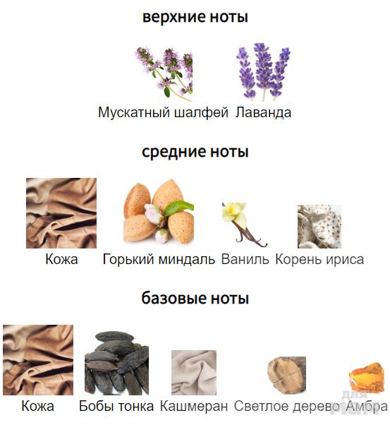 В нем звучат кожа, ирис, мускатный шалфей и горький миндаль. И без того мягкий дымчатый аромат дополняют теплые ноты кашмерана и бобов тонка.