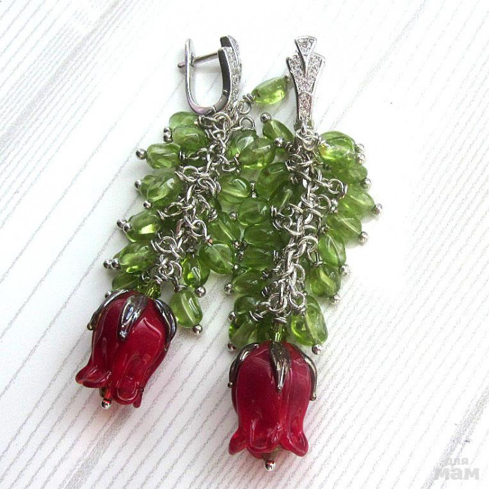 Роскошные серьги из великолепных авторских бутонов красной розы в технике лэмпворк, сделанных ручным способом в огне горелки и кусочками натурального хризолита цвета молодой листвы. Лэмпворк всегда удивительный, всегда роскошный. Всегда заметный и эксклюзивный.