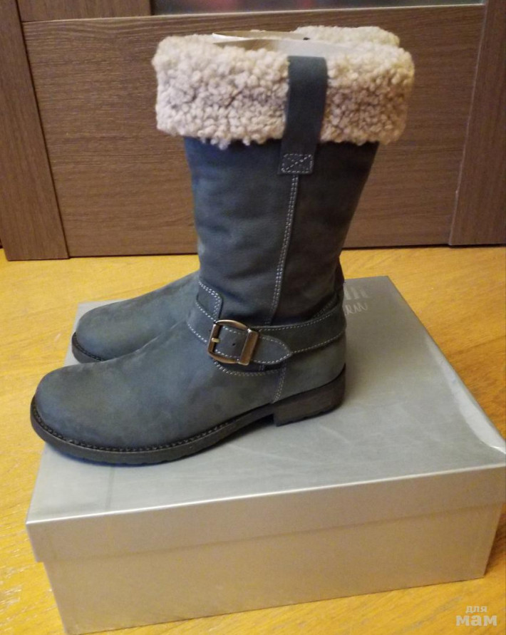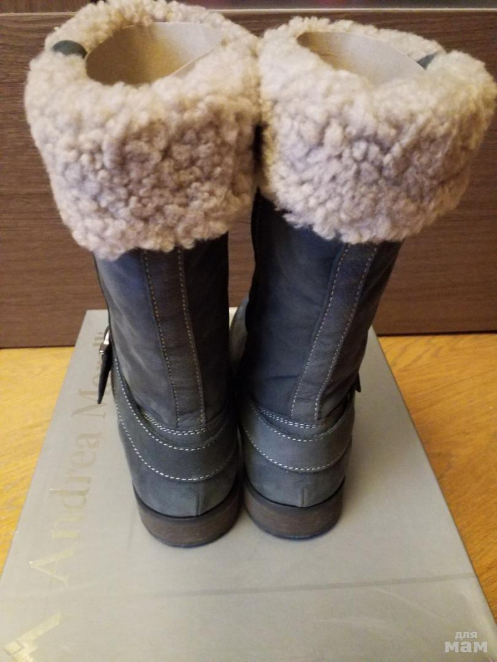 Новые, в коробке. Зимние сапоги нубук р. 33. Стелька 22 см. Фирма Andrea Morelli Италия. Внутри цигейка, густая. Цвет серый. С меховым отворотом, украшены ремешком с застёжкой, на молнии. Шикарные. Мех внутри густой. Мы к сожалению их переросли. Отправляю в регионы.