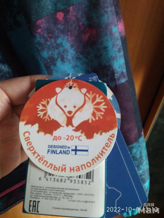 Новая фирменная зимняя курточка финского бренда TokkaTribe. Непромокаемая и непродуваемая. Выдерживает мороз до -20 (так заявлено на этикетке). Внутри есть утяжка, на воротнике трикотажная вставочка, рукава на резинке, в капюшоне тоже есть резинка для комфортной и надежной посадки. Капюшон на кнопках, карманы на молнии. Была куплена в Детском мире с хорошей скидкой (изначально стоила 4500). Длина 60, ширина между подмышками 44, рукав от плеча 54 + плечо 10.