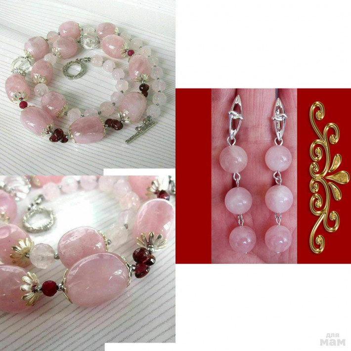 Роскошный комплект - колье и сереги с натуральным мадагаскарским розовым кварцем, рубином и мадагаскарским гранатом-альмандин. Шикарный цвет, шикарное качество, ясно читаемый рисунок камня.