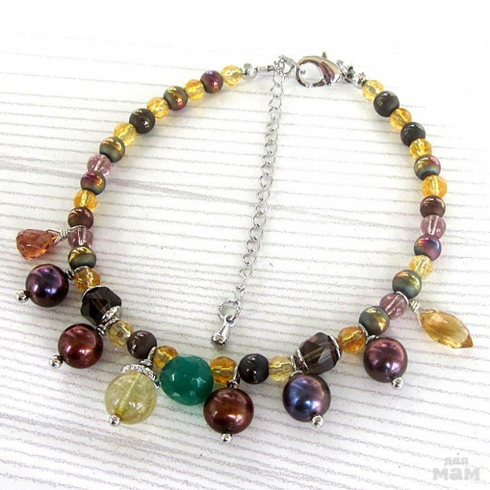 Изящный браслет из целой россыпи натуральных камней: цитрин, натуральный радужный жемчуг, раухтопаз, султанит, волосатик с золотым рутилом.