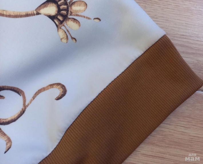Удивительное платье свободного силуэта из неопрена серо-голубого цвета с узором в стиле с авторским орнаментом "вензель". Трикотажная резинка коричневого цвета по нижнему краю. Прямой рукав 3/4 с заниженной линией плеча.