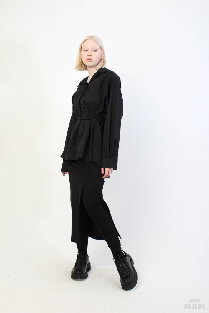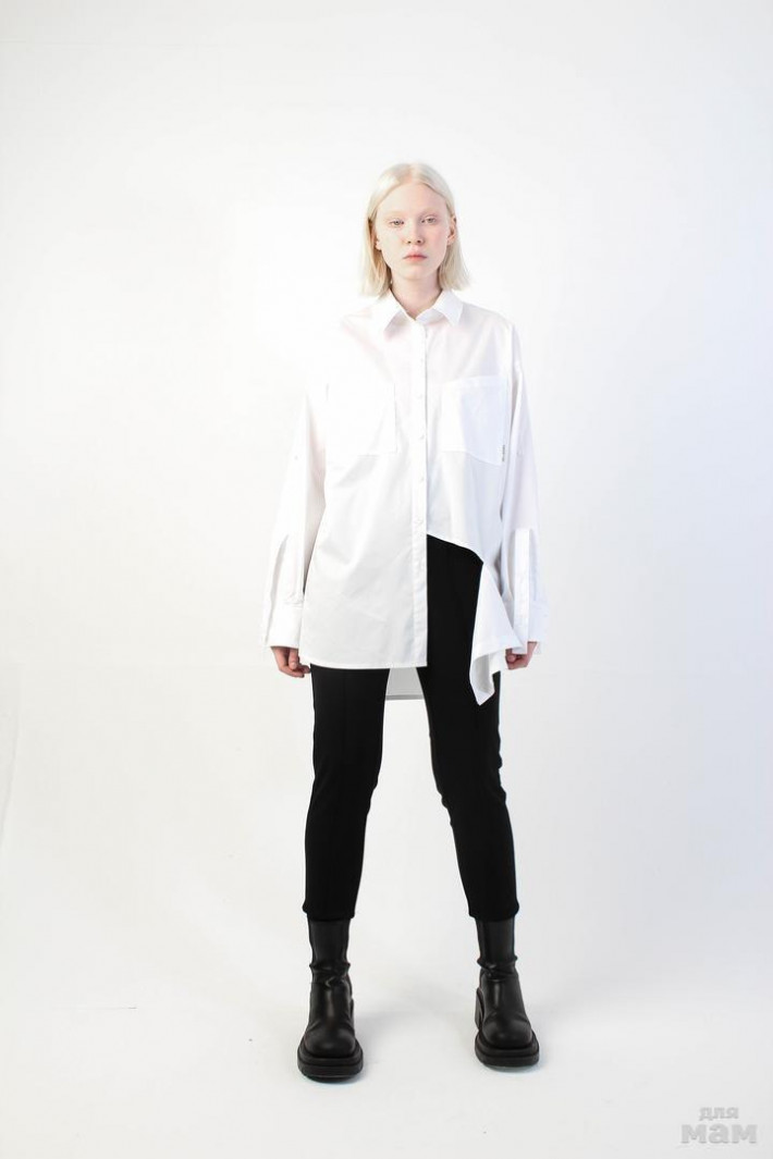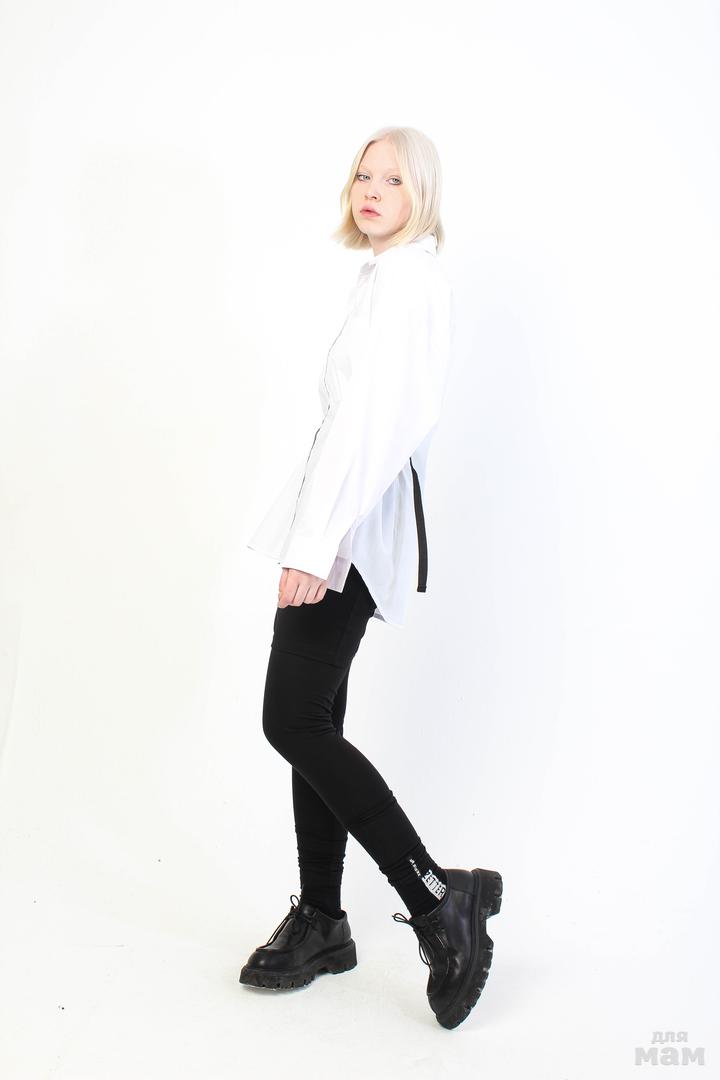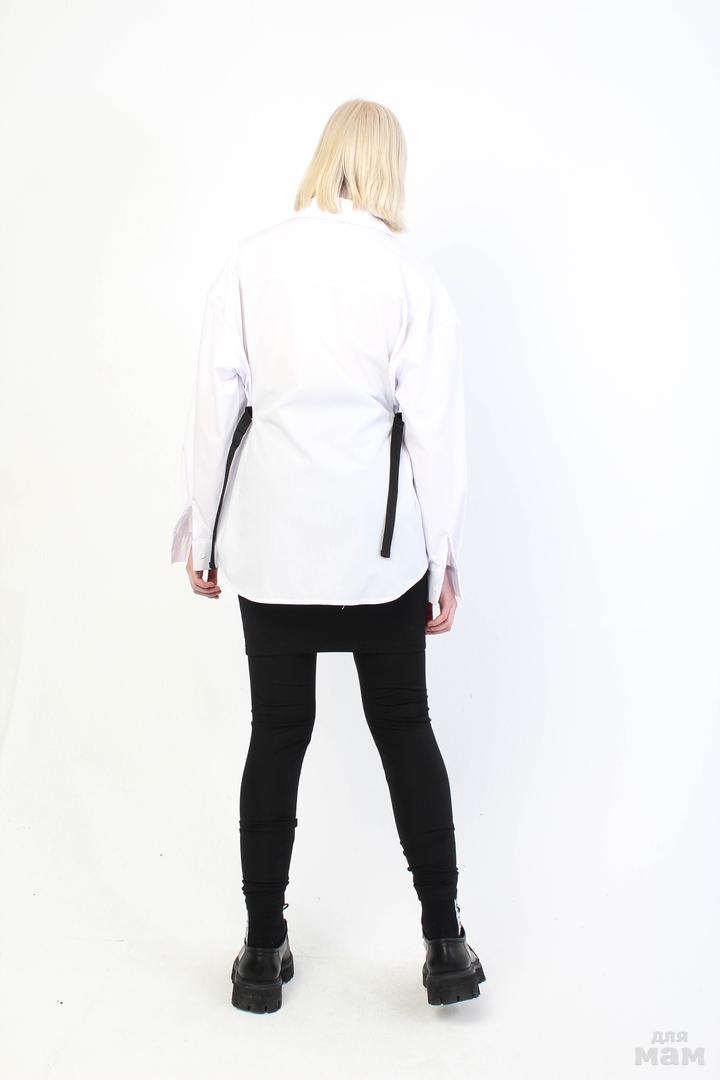 Удлиненная хлопковая блуза-рубашка, прямого кроя с закругленным низом, длинный рукав с манжетом, рубашечный воротник. Украшена вшитыми перевязками, с помощью которых, можно сформировать корсет.