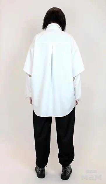 Удлиненная хлопковая блуза-рубашка, прямого кроя с закругленным низом, длинный рукав с манжетом, рубашечный воротник. Украшение -съемная накидка имитирующая накинутую на плечи кофту