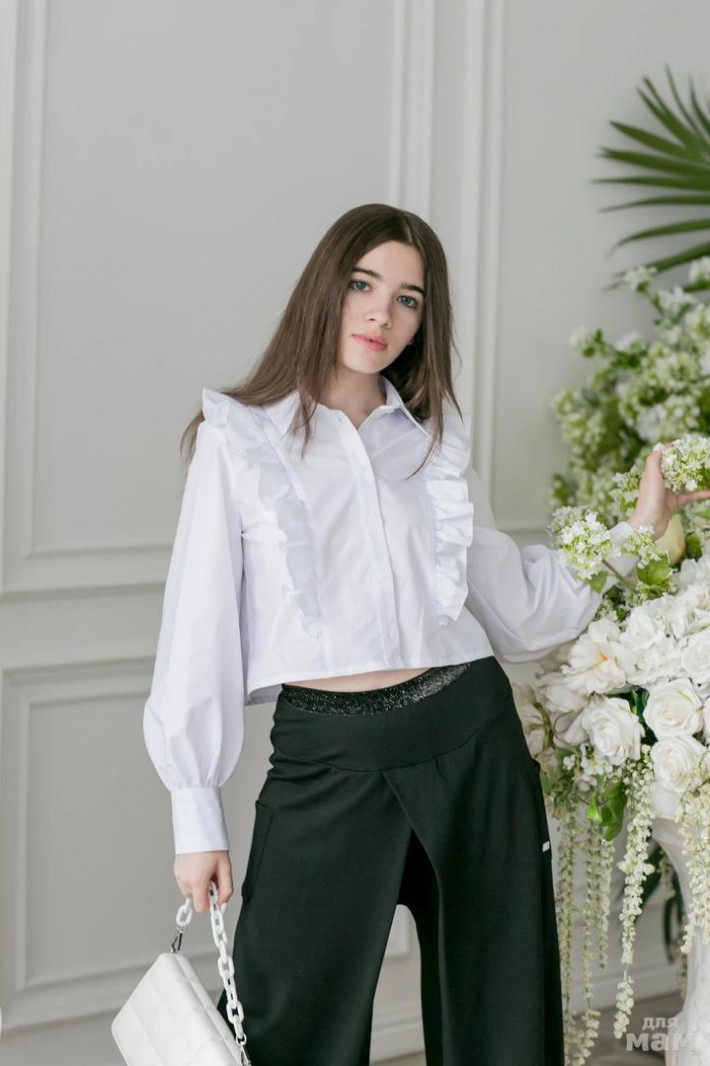Рубашка- блузка, классического, прямого кроя. На груди имеется рюша , что делает блузку более интересной, позволяя применять ее как в деловом, так и в повседневном и праздничном образах! Блузка отлично сочетается с джинсами, юбками, шортами, а также брюками любого стиля. С ней легко можно составить образы от романтичного до **Casual (Кежуал).**