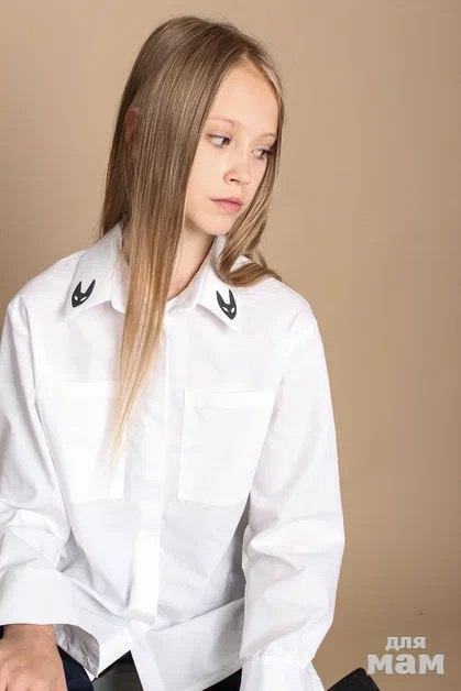 Стильная хлопковая рубашка прямого кроя, полочка и спинка  украшены силиконизированными нашивками . Рукав с мелкими складочками и широким манжетом. Состав ткани: 67% хлопок, 33%полиэфир