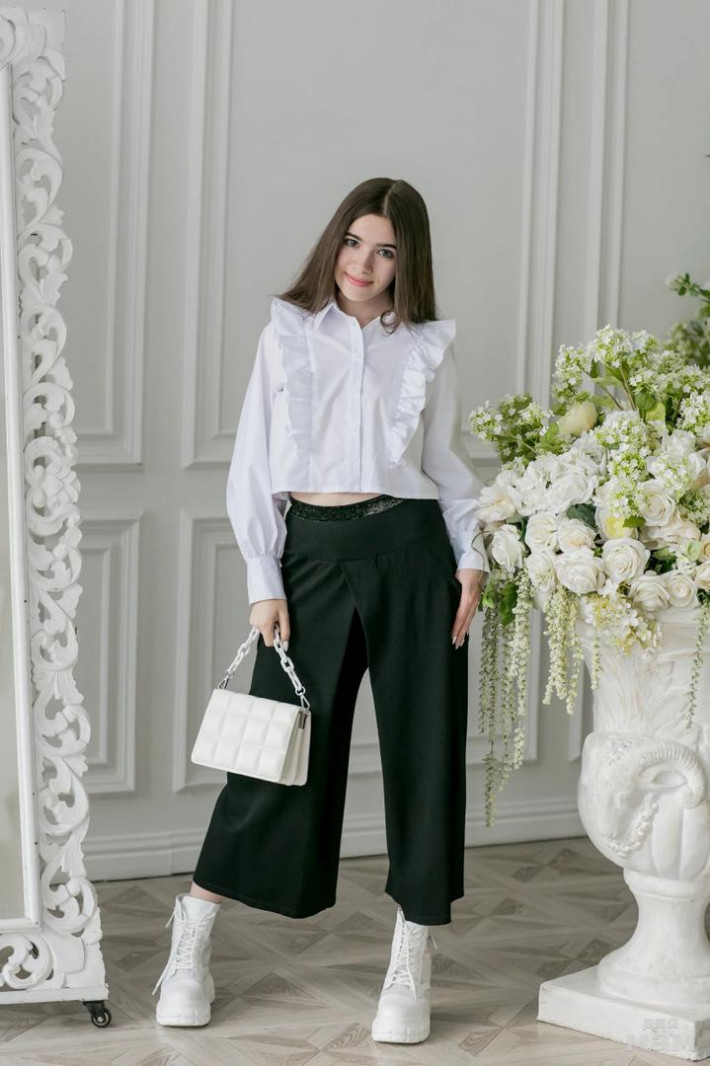Рубашка- блузка, классического, прямого кроя.Нежные вертикальные воланы спереди очень стройнят. Навыпуск и в заправленном виде. Нарядная блузка приятна к телу.