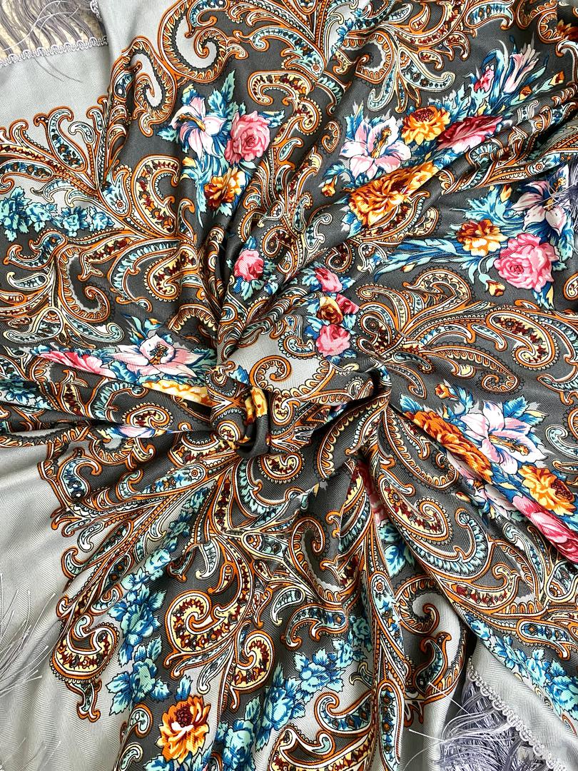 Платок в русском стиле, с шелк. кистями. Принт пейсли. Шерсть 80%, вискоза 20%