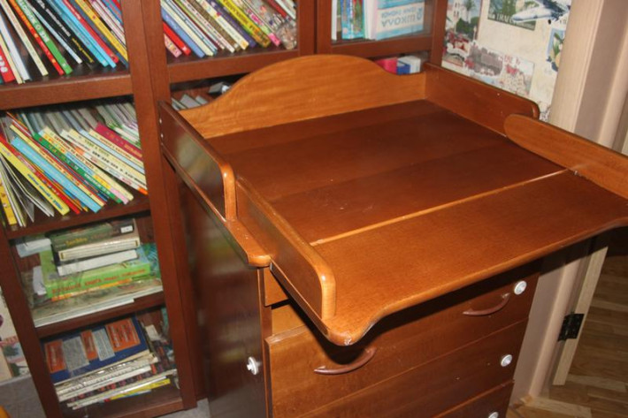 Комод с пеленальным столиком, Можга (Красная Звезда).Б/у, (есть нюанс:на среднем ящике нет одной ручки) 3 ящика + открытая полка. Цвет: коричневый. (как на фото). Замеры:Длина: 72 см, Глубина: 49см (с разложенным пеленальным столом: 67см ), высота: 90 см. (до пеленальной поверхности). Самовывоз. Район Митино.