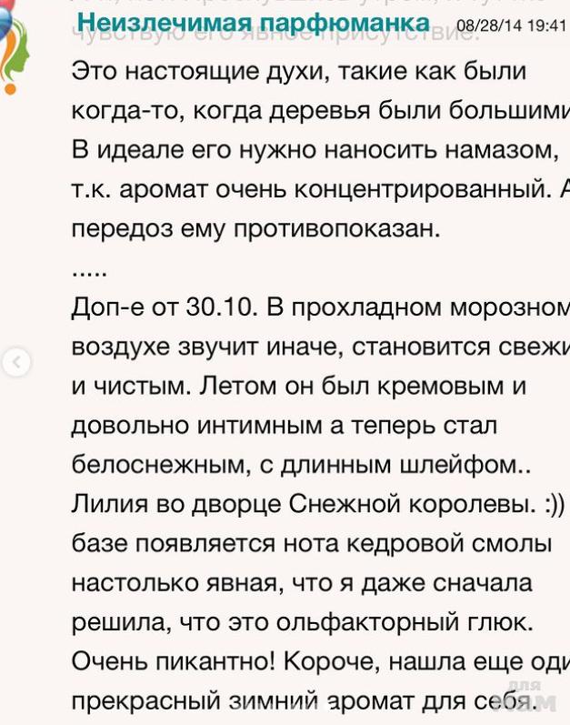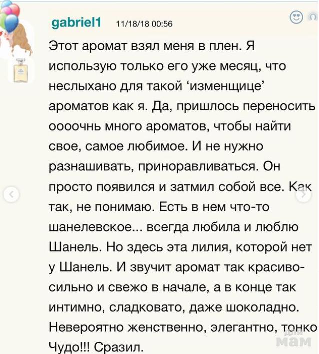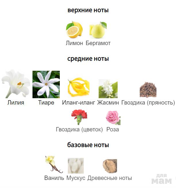 Духи нежные, обволакивающие и тёплые, они словно концентрированная женственность, разлитая по флаконам. С этим ароматом вы будете всегда чувствовать себя прекрасной и воздушной, и не важно, какая погода за окном и сколько дел накопилось! Солирует в композиции, конечно же, лилия. Дополняют этот нежный цветок гвоздика и жасмин, роза, иланг-иланг, тиаре – целый вихрь из разных цветов. Лёгкость аромату дают лимон и бергамот, а теплоту и чувственность – древесные нотки, ваниль и мускус. Все ингредиенты образуют роскошное, тягучее, словно мёд и нежное, словно шёлк сочетание – духи Lily.