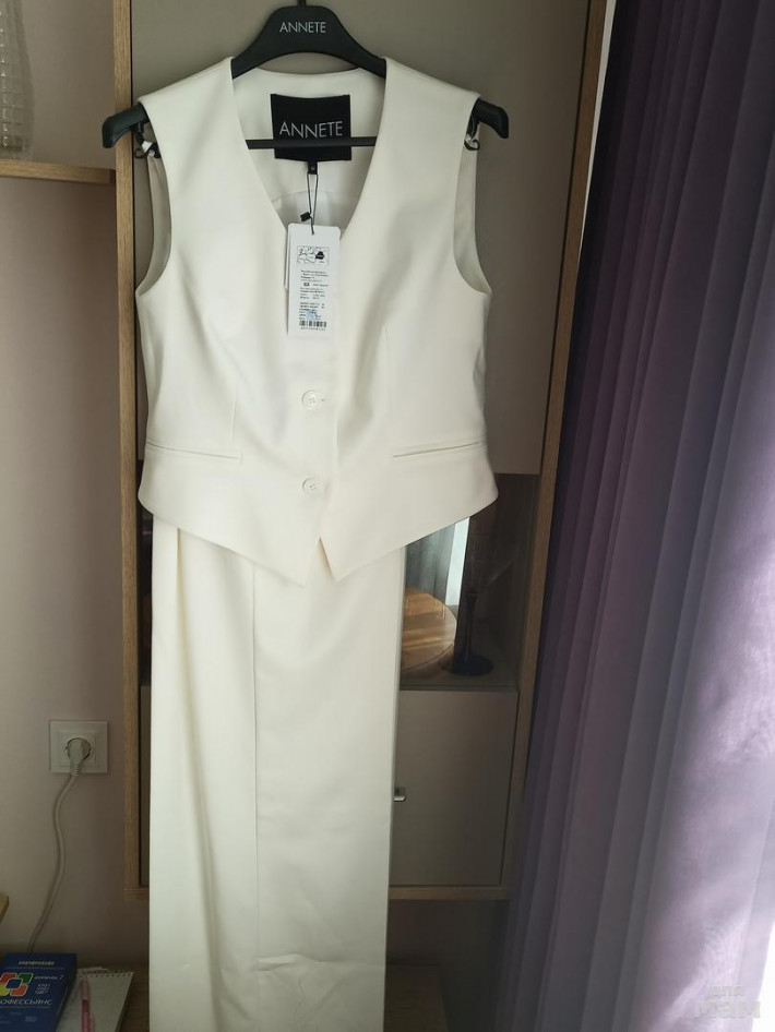 Комплект состоит из укороченного жилета и брюк выполнен из костюмной ткани светлого оттенка.