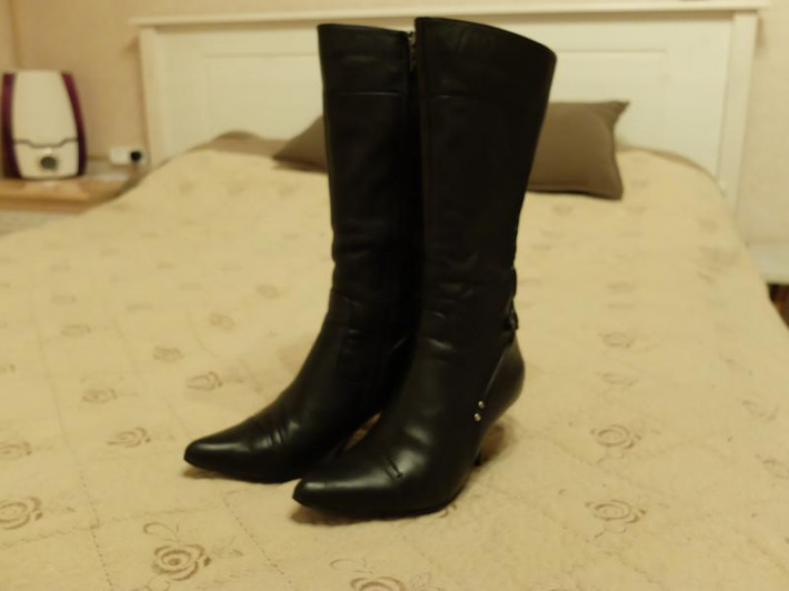 Продам очень красивые осенние сапожки из натуральной кожи. б/у. Удобная колодка. Красиво на ножке смотрятся. состояние очень хорошее. Носила мало, на выход. На ножку 23-23,5 см. На ножку средней полноты или узкую. Высота голенища 30 см. Каблук 8 см. Объем в верху около 33 см.