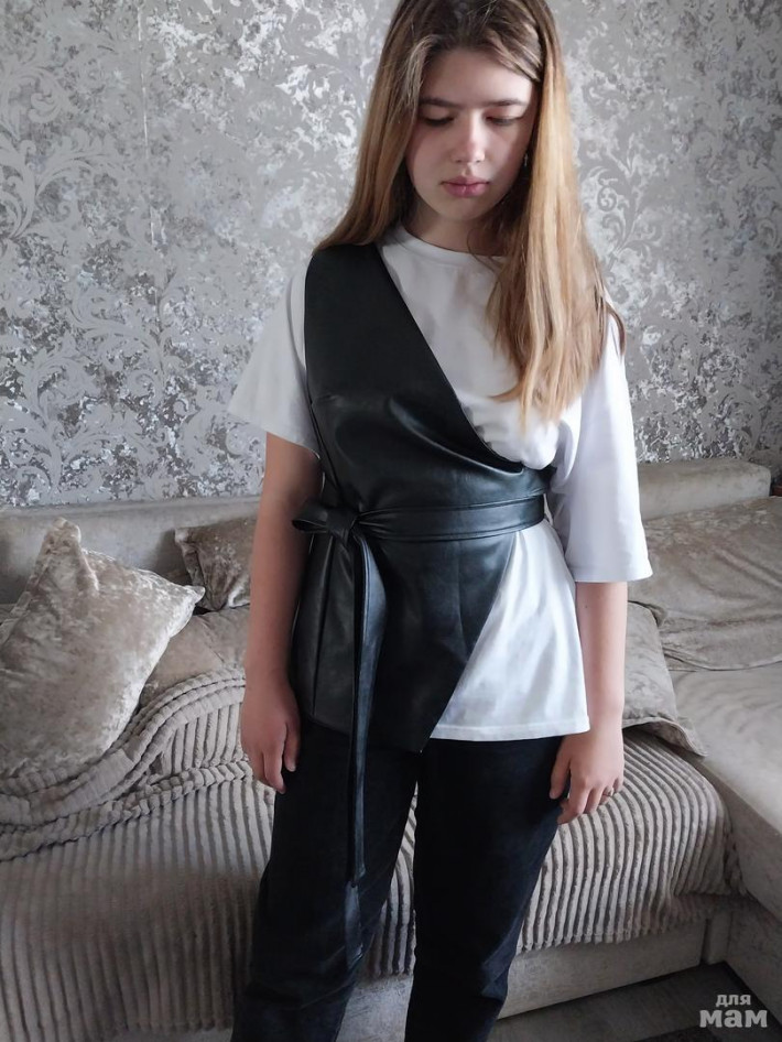 Стильный асимметричный жилет на одно плечо из экокожи. Изделие на подкладе, хорошо держит форму. Завязывается по типу "запАха". Прием многослойности помогает интересно и стильно обыграть базовые вещи. Новый. Размер L (46), 1450₽