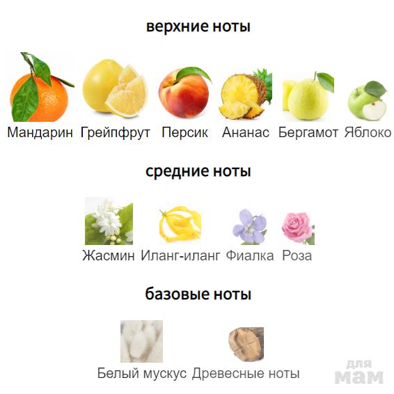 Верхние аккорды: цитрусовые, яблоко, персик, ананас;