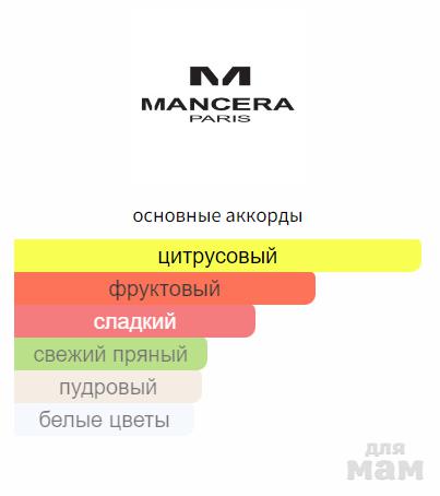 Аромат Mancera Sicily является сложным и многогранным, игристым и солнечным парфюмом, который дарит волшебное ощущение лета посреди холодной зимы. Композиция построена на переплетении освежающих цитрусовых нот, дополненных легкой сладостью и деликатностью фруктов, с цветочно-пудровыми ароматами цветов, окруженных насыщенным, светлым и воздушным ореолом древесно-мускусных нот.