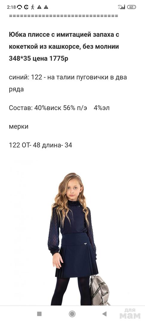 Здравствуйте. В наличии размер 122, верно? Юбка плиссе с имитацией запаха с кокеткой из кашкорсе, без молнии 348*35 цена 1775р учёт синий