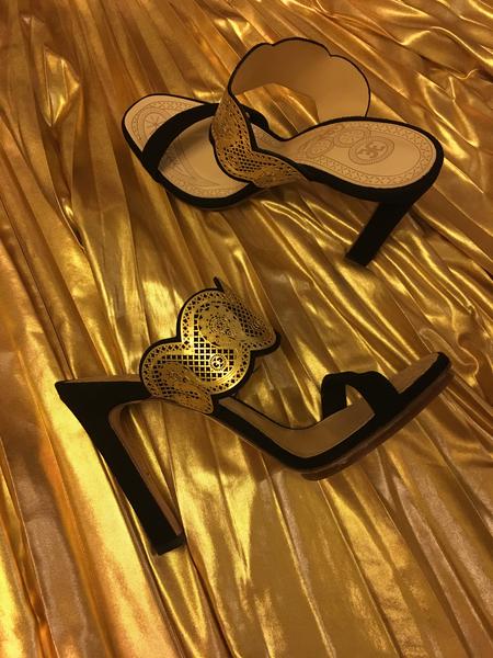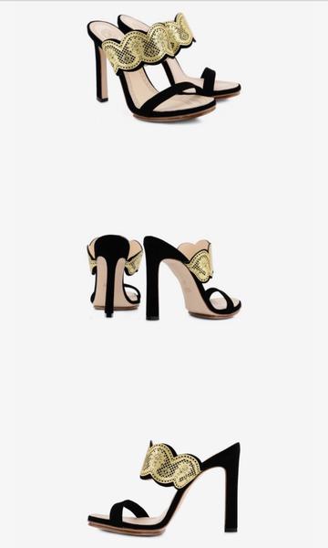 Босоножки из мягкой замши с фронтальным ремешком, декорированным металлической вышивкой. Декорированная внутренняя стелька из кожи. Кожаная подошва. Каблук декорированный 100 мм. Куплены на офиц.сайте, мне в подъеме безнадежно малы , в размер.