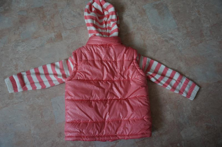 Продам новую куртку-жилет для девочки. Размер 104. Утепленный, внутри флис. Рукава и капюшон из трикотажа.