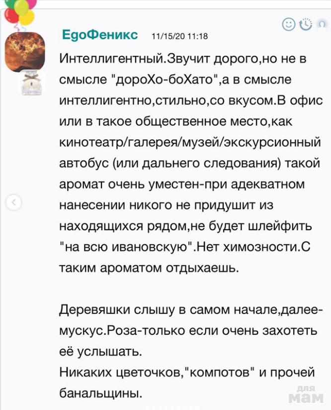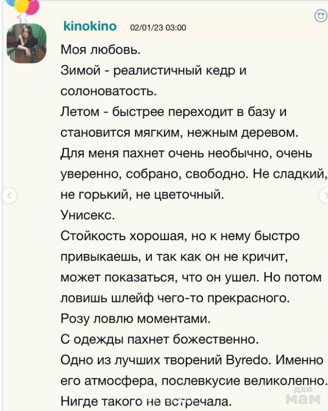 Он многогранен. Парфюм получился уютным и умиротворяющим, теплым и успокаивающим. Сильным и уверенным. Вы словно оказываетесь в хвойном лесу, вас окутывает смолистым ароматом с легкой ноткой влажной земли и цветов. Верхние аккорды играют бархатом лепестков розы. В сердце аромата раскрывается тот самый кедр. Он легкий, сухой смолисто хвойный и потрясающий. В завершении звучат землистые нотки горьковатого ветивера, которые сглаживает тепло и сладость мускуса.