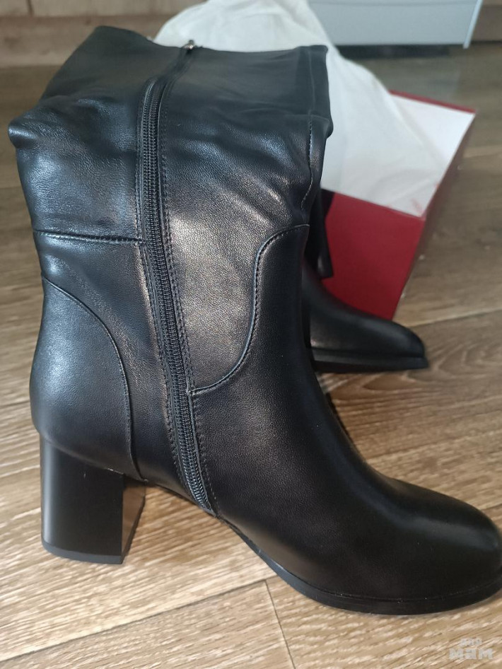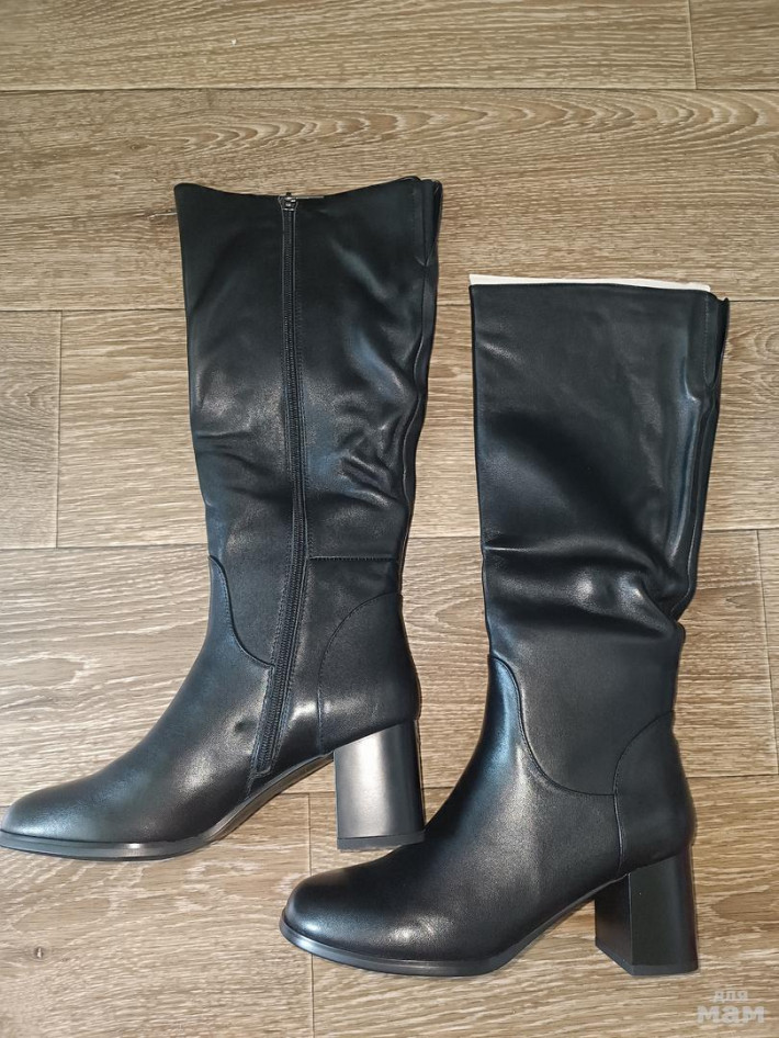 Натуральная кожа. Подкладка: байка. Каблук 6 см, высота 36 см, объем голенища 36 см (в 39 в размере).