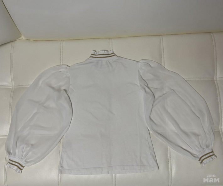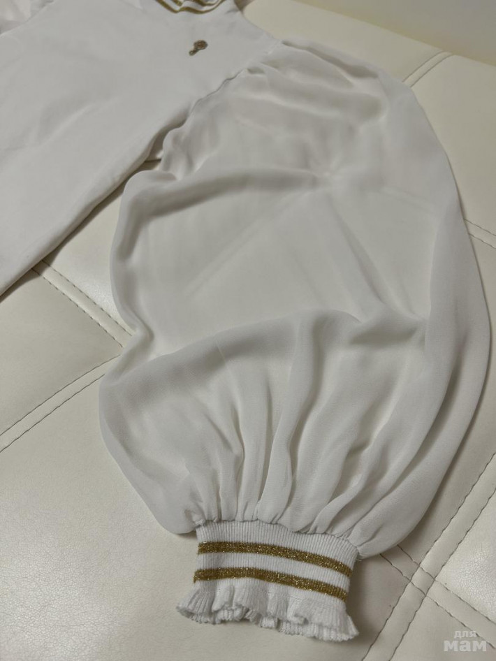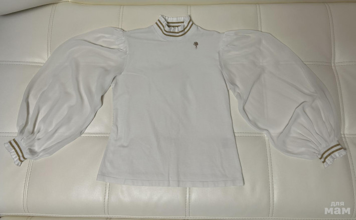Блузка просто бомба, поэтому носили ее часто, но она в приличном состоянии. Имеются затяжки на каждом рукаве по несколько штук и на одном рукаве 2 микро пятнышка. Затяжки можно иголкой убрать на изнанку. Позолота с цветочка на груди немного стерлась, стразинка под ним цела и очень блестит