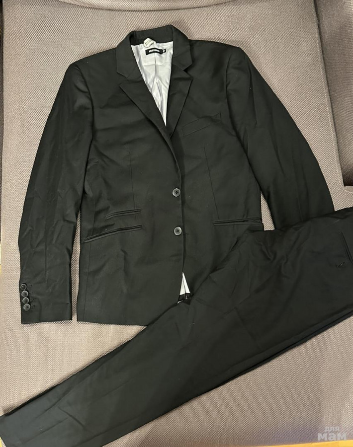 Костюм черного цвета, узкие укороченные брюки, нужна химчистка. В цене учтено. Норм состояние, дыр, зацепок, порезов нет. Замеры: брюки пот 45 см, длина 100, шаговый 79см, ширина брючины внизу 17,5см. Пиджак пог 50, рукав 68см, плечо 14 см