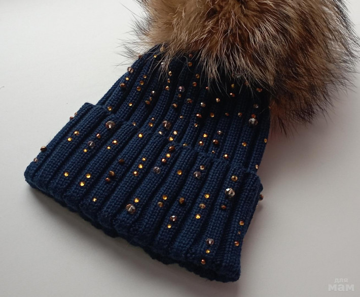 Классический синий с декоромм в цвете золото (бусины хрусталь, стразы) и шикарным, "неуправляемым" помпоном😀