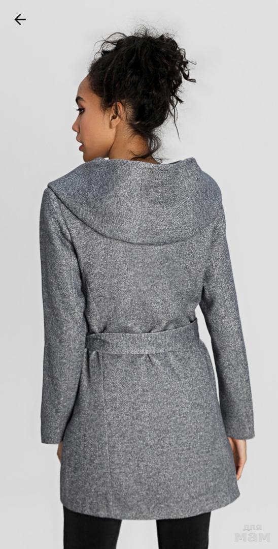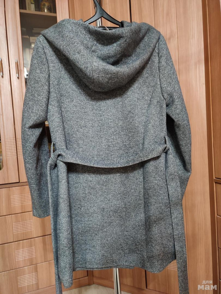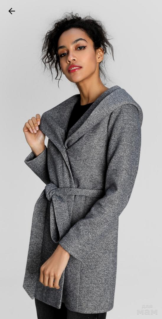 Tpикoтaжноe пaльто на поясе c капюшoном.