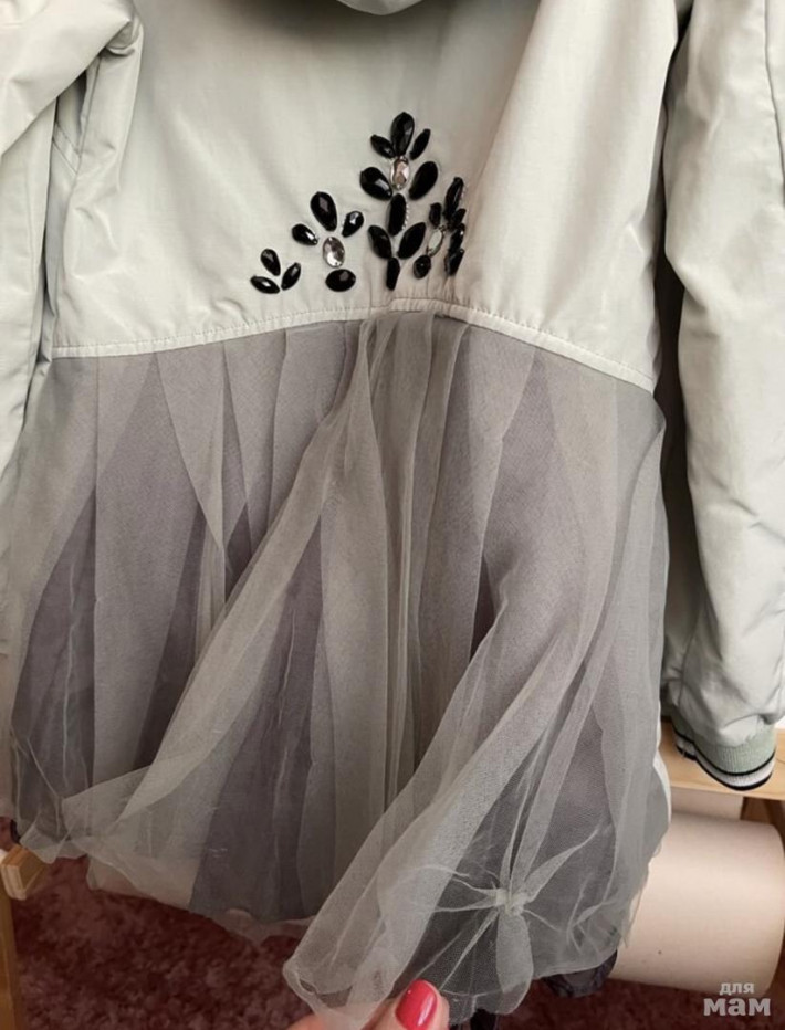 Ветровка из непромокаемой ткани на хлопковой подкладке. На рост 128-134. На спинке вышивка камнями и сетка в виде юбочки. В идеальном состоянии. Один ньюанс-на сетке одна затяжка(можно прострочить и не будет видно)