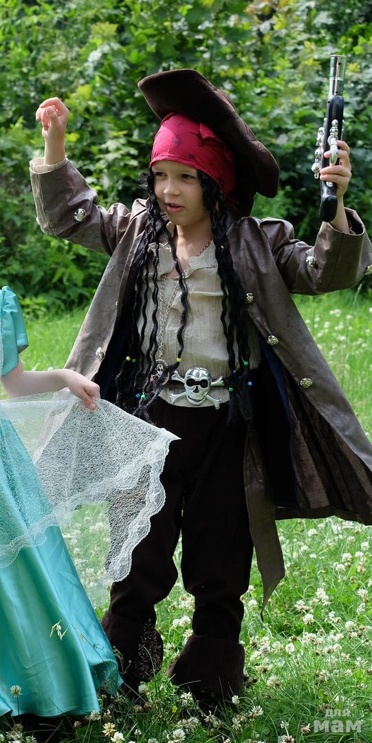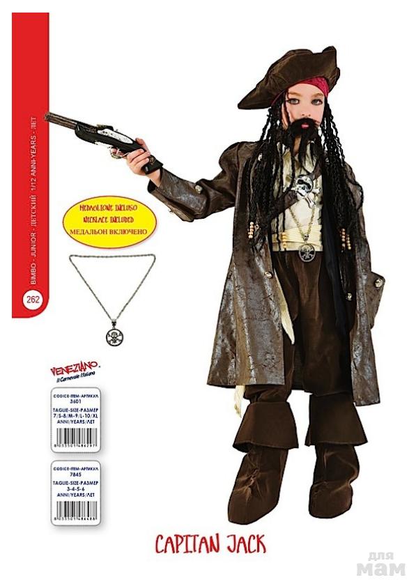 В костюм входит: Шляпа + камзол + перевязь + кушак + жилет + рубаха + штаны + "сапоги" + бандана с косичками +борода + накладка на глаз +цепь пиратская +пистолет не стреляющий :-)