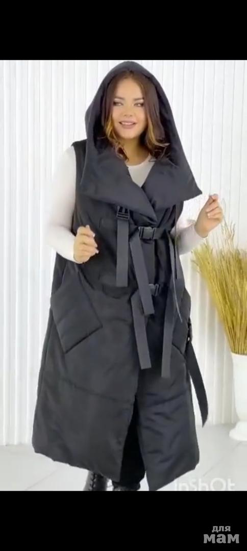 Черный утепленный жилет (безрукавка) с капюшоном. Легкий. Застегивается на карабины, по объему можно регулировать. Очень классный. Можно и на р.52 на толстый костюмом на флисе.