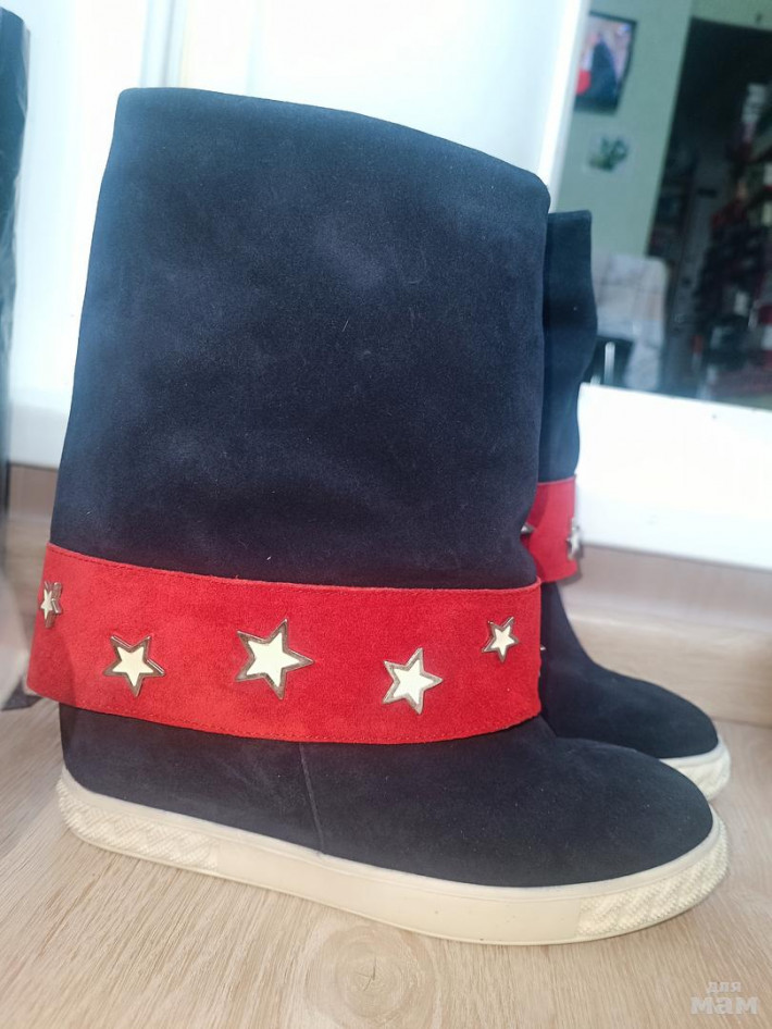 Танкетка. Без молнии, сплошное голенище, которое можно закатать и получатся полусапожки. Размер 38 и 39. В размер. Нубук.