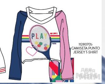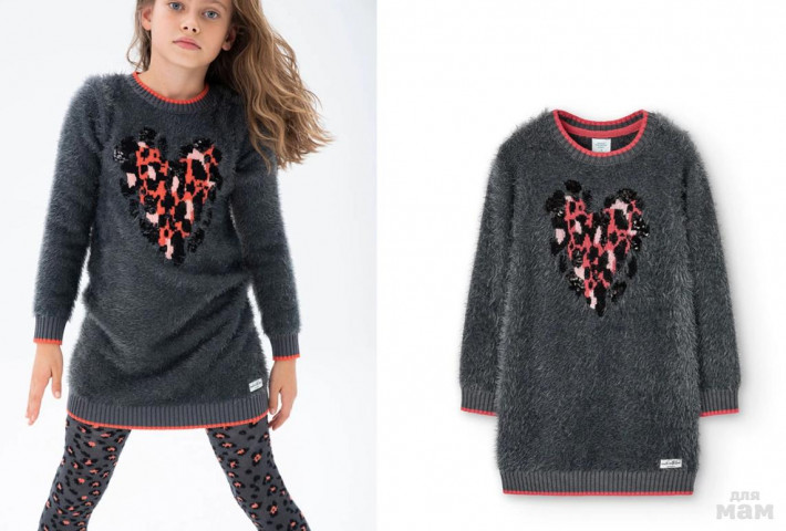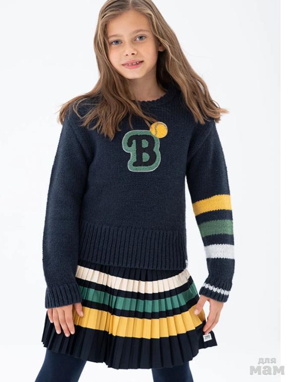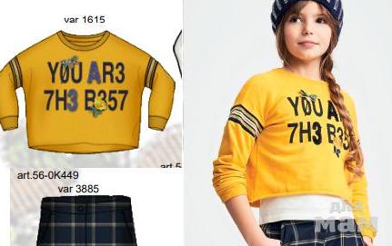 Пуловер с длинным рукавом из трикотажной велюровой ткани. В качестве декора используется флоковая надпись и принт на плечах. К надписи пришита кисточка из ниток, внизу полочки нашивка