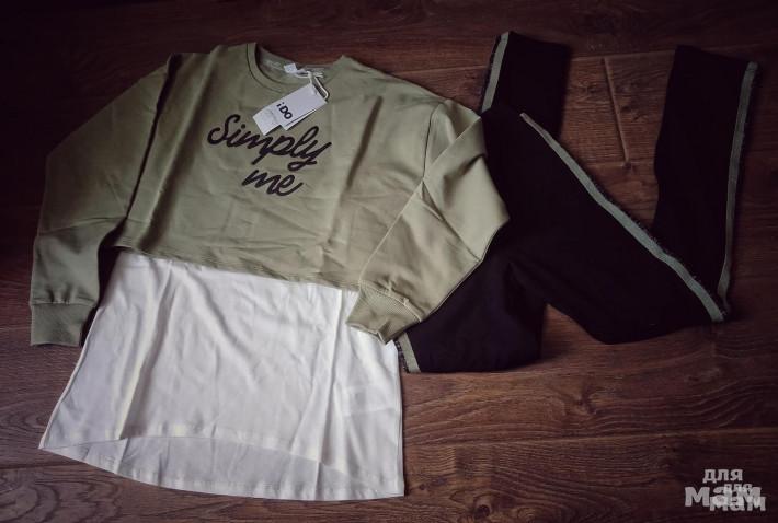 Костюм 3-ка. Свитшот укорочен с начёсом внутри, футболка макси, брюки эластичные с лампасами пояс эластичный. Размер 164, лучше до 158 см Очень благородный цвет и удобный комплект.