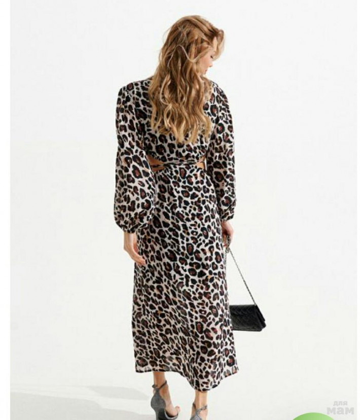 Роскошное платье с декоративными вырезами выполнено из струящегося полотна с анималистическим принтом.