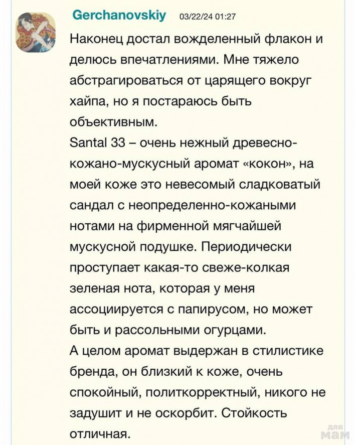 В нем скрыт особенный потенциал, который не может не привлекать к себе внимание с первых секунд близкой встречи. Древесные мотивы заморского сандала и кедра из Вирджинии изумительно переплетаются с пряными оттенками восточного кардамона. Благоухание воздушной фиалки великолепно дополняется умопомрачительным запахом древнего папируса. Ноты натуральной кожи выступают сердцем парфюмерной композиции. Окончательные акценты расставляют заманчивые аккорды экзотической амбры и сладострастного ириса. Великосветские мероприятия, вечерние прогулки по темным аллеям набережной или важные переговоры на высшем уровне - любое событие будет по достоинству украшено утонченностью аромата Le Labo Santal 33.